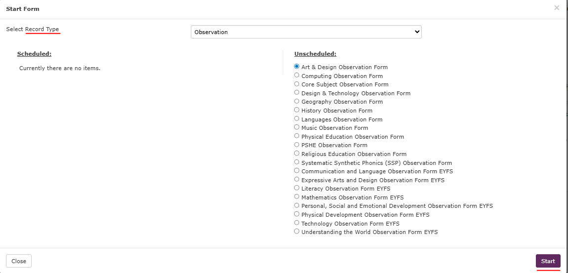 2) Choose a Record Type such as Observation – then choose the form you wish to add to the timeline. Press start and the form will be added to the timeline.